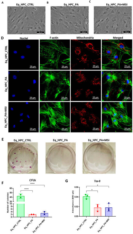 The impact of PA exposure and MSI-1436 treatment on the cellular morphology of Eq_HPCs was assessed using bright-field and confocal microscopy. The results indicate that cellular stress can frequently alter the architectural organization of tissues and cells (Figure 1A–D). Control cells exhibited a typical oblong and spindle-shaped morphology. In contrast, cells cultured in standard medium, PA-treated, and MSI-treated conditions showed minimal alterations in their general shape (Figure 1A–C). However, the size of the cell bodies decreased. Additionally, numerous small granular materials were observed around the cell bodies of PA-treated and MSI-treated cells, accumulating within the cytoplasm around the nuclei. These changes suggest the presence of endoplasmic reticulum stress, cytoplasmic vacuolation, or even apoptotic fragmentation. Detailed morphological analysis of the cellular cytoskeleton and nucleus by confocal fluorescence microscopy showed that control cells exhibited an extensive and dense F-actin network with an inscrutable structure. The application of PA to Eq_HPCs resulted in a change in the shape and localization of the F-actin, with filaments concentrated around the DAPI-stained cell nuclei. However, in MSI-supplemented hepatic cells compared to the control, F-actin formed a denser and wider interconnected matrix, highlighting the morphology-preserving effects of MSI application (Figure 1D).
