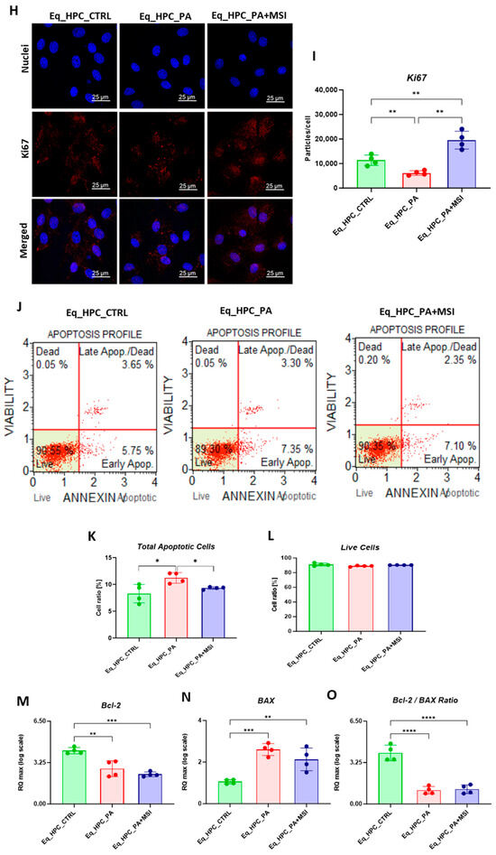 The mitochondrial apoptotic pathway is mediated through Bcl-2 family proteins, including both pro- and anti-apoptotic members such as Bax and Bcl-2, respectively [47]. Therefore, we examined the expression profiles of the BCL2 and BAX genes in Eq_HPCs treated with PA or MSI-1436 (Figure 1M–O). The results showed a significant reduction in BCL2 expression under both treatment conditions compared to control cells (p < 0.01 for PA and p < 0.001 for MSI) (Figure 1M). On the other hand, palmitate treatment increased the expression of BAX (Figure 1N) compared to control cells (p < 0.001), indicating the induction of pro-apoptotic processes. Similar trends were observed in the MSI-treated cells, where BAX expression remained significantly higher (p < 0.01) than that of the control cells. We also found that the BCL2/BAX ratio was highest in the control cells compared to both treatments (Figure 1O).