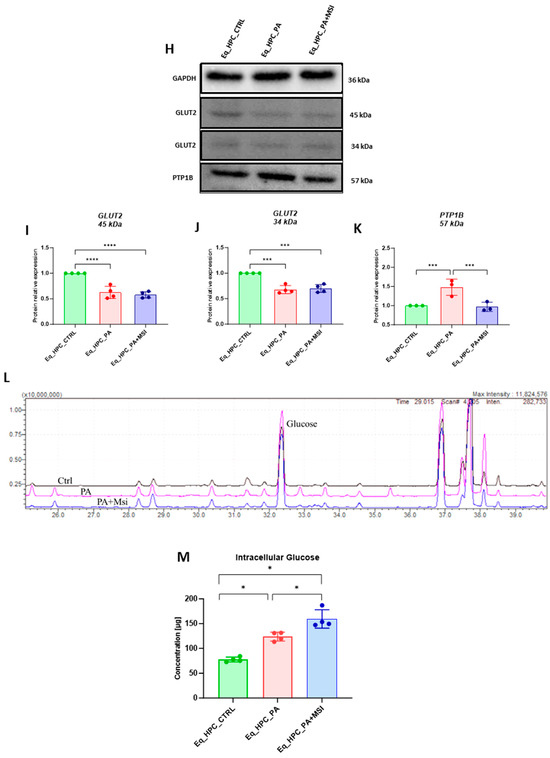 Next, the protein expression of PTP1B and GLUT2 after PA and MSI-1436 treatment was investigated using SDS-PAGE and Western blot analysis (Figure 2H–K). The application of palmitate increased PTP1B protein expression (Figure 2K), reaching a statistically significant difference compared to control cells (p < 0.001). PTP1B works as a negative regulator for the insulin signaling pathways [49]. However, following MSI-1436 treatment of PA-stressed cells, a visible downregulation of PTP1B expression to comparable levels of the control cells (p < 0.001) was noted. Subsequently, the relative expression of the two GLUT2 isoforms, 34 kDa (Figure 2J) and 45 kDa (Figure 2I), in PA-stressed cells was significantly decreased (p < 0.001 and p < 0.0001, respectively) in relation to the control. Importantly, the application of MSI-1436 did not contribute to the restoration of GLUT2 basal levels (p < 0.0001 and p < 0.001, respectively) when compared to both control groups. Additionally, the potential effect of MSI-1436 treatment on glucose uptake was measured by intracellular glucose content using GC/MS analysis. The results showed that intracellular glucose concentration in PA-stressed cells and PA-treated cells with MSI-1436 revealed a significant increase compared to control Eq_HPCs (p < 0.01 and p < 0.01, respectively). Furthermore, a significant difference was observed between Eq_HPCs stressed and treated with MSI-1436, with p < 0.03 (Figure 2L,M).