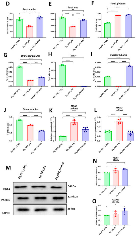 MSI-1436 effect on mitochondrial morphogenesis in Eq-HPCs. (A) The effect of PA- and MSI-treatment on cells stained with Mito Red. MitoGraph software was used to process the images. MitoGraph turns 3D bioimages into surfaces. (B) The node-and-edge structures (skeletons) from mitochondrial networks. (C) Images showing mitochondrial number and distribution in Eq-HPCs relative to cells after PA induction and MSI-1436 application. The bar graphs show morphological subtypes of mitochondria: (D) total number in the cell, (E) total area in the cell, (F) small globules, (G) branched tubules, (H) loops, (I) twisted tubules, and (J) linear tubules. (K) MFN1 and (L) MFN2 measured with RT-qPCR. The results from experiments are normalized to GAPDH mRNA levels and expressed as fold change over the non-treated group as the control. (M) Western blot analysis of PINK1 (54 kDa) and PARKIN (52.5 kDa) normalized to GAPDH (36 kDa). (N,O) The color code of the bars shows the corresponding changes in putative kinase 1 (PINK1) and Parkin in Eq_HPCs treated with PA and MSI-1436, which commonly interact in a mitophagy pathway initiated by loss of the mitochondrial membrane potential. Results are expressed as mean ± SD. Significant changes (* p < 0.05, ** p < 0.01, *** p < 0.001, and **** p < 0.0001) are marked with an asterisk.