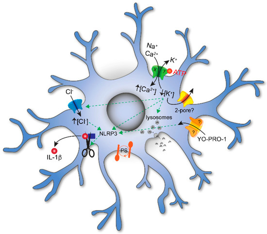 - Sanz, J.M.; Di Virgilio, F. Kinetics and Mechanism of ATP-Dependent IL-1β Release from Microglial Cells. J. Immunol. 2000, 164, 4893–4898. [Google Scholar] [CrossRef] [PubMed]