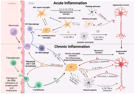 Model for microglial-driven neuroinflammation. Neuroinflammation can be subdivided into acute and chronic phases. Acute neuroinflammation is characterized by activation of resident immune cell populations, release of proinflammatory mediators including cytokines/chemokines, infiltration of peripheral immune cells to assist in the immune response, and phagocytic activity to reduce cellular debris. When inflammation persists past the initial injury event and homeostasis is not maintained, chronic neuroinflammation commences. This phase is characterized by sustained microglial activation and gliosis measured by heightened release of proinflammatory cytokines/chemokines, reduced phagocytosis, and neurodegeneration. Created with BioRender.com accessed on 8 January 2024.