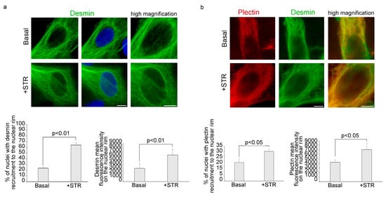Desmin and plectin 1 recruitment to the nuclear rim increases after cyclic mechanical stretching. Immunofluorescence analysis of cytoskeletal proteins was performed in human myoblasts under basal conditions (Basal) or upon cyclic stress (+STR). (a) Immunostaining and high magnification of desmin (green). 4,6-diamidino-2-phenylindole (DAPI, blue) was used to counterstain cell nuclei. The percentage of cells showing desmin recruitment to the nuclear rim and desmin mean fluorescence intensity on the nuclear envelope was reported in the graphs below. (b) Double immunofluorescence analysis of plectin 1 (red) and desmin (green) and high magnification of merge image on the right. Statistical analysis of plectin recruitment to the nucleus and plectin mean fluorescence intensity on the nuclear envelope was reported in the graphs below. Scale bars, 10 μm. Three biological replicates were used in each experiment and statistically significant differences (p < 0.05 or p < 0.01) between values are indicated.