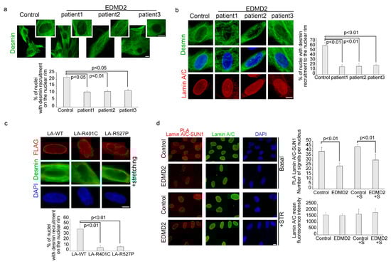 To evaluate the above reported interplay in myoblasts carrying other disease-causing LMNA mutations, human control myoblasts were transfected with FLAG-Lamin A R527P and FLAG-Lamin A R401C or FLAG-Lamin A wild-type. Immunofluorescence analysis of FLAG-tagged proteins and desmin, allowed us to evaluate the subcellular localization of overexpressed lamin A and endogenous desmin in myoblasts subjected to mechanical stretching. Results shown in Figure 3c revealed that desmin was localized at the nuclear envelope in 40% of stretched myoblasts expressing wild-type lamin A, whereas it was not recruited to the nuclear periphery in myoblasts expressing LMNA-mutants (Figure 3c). These results showed that non-functional lamin A/C affected desmin nuclear recruitment upon mechanical stretching independently of the LMNA mutation.
