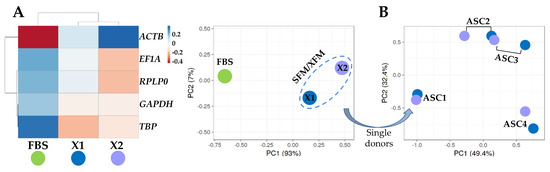 To identify an overall influence of the culture conditions, either FBS-containing or SFM/XFM, on the expression trend of the five analyzed HKGs, a hierarchical clustering and principal component analysis (PCA) were performed on the Ct values under the different media of each gene (Figure 3A). There was a clear emergence of a sharp dichotomy between FBS-containing medium and the SFM/XFM samples that clustered together. To further dissect the effect of the chemically defined media, a deeper PCA was run with all eight samples cultivated in absence of FBS (Figure 3B). The plot showed that a donor effect prevailed, with the samples of the same donor in the two different synthetic media clustering together. Overall, these data suggest that SFM/XFM are able to homogeneously drive HKGs signature, maintaining a donor-dependent molecular signature.