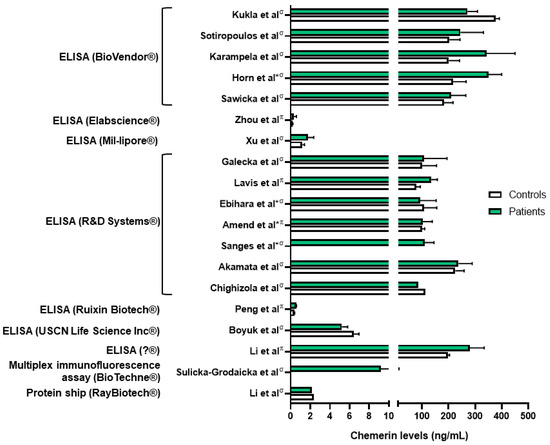Chemerin levels were assessed in several sepsis and lung infection conditions. Regarding COVID-19 infection, one group reported higher serum chemerin concentrations in healthy controls compared to COVID-19 patients [45]. In a second study, the same group did not highlight significant differences in serum chemerin levels between non-severe and severe COVID-19 patients [46]. They observed a decrease in chemerin concentrations between days 1 and 7, followed by an increase between days 7 and 28 in moderate and severe patients, with a continuous increase in mild patients [46]. The authors did not find any correlation between chemerin levels and inflammatory biomarkers and hypothesized that the increase in serum chemerin concentrations was associated with the resolution of inflammation. However, chemerin levels observed in these two studies were significantly different, in the pg/mL range when measured with multiplex in Sulicka-Grodzicka et al. [46] and in the ng/mL range when assessed with ELISA in Kukla et al. [45], making it difficult to interpret their data (Figure 3). Esendagli et al. also measured the chemerin serum concentration of COVID-19 patients at hospital admission and separated them according to their prognosis, which depended on the type of ventilation and survival. Patients with a good prognosis presented higher chemerin levels at admission compared to patients with a bad prognosis; however, no significant difference was observed if patients had lung sequellae or not [47].