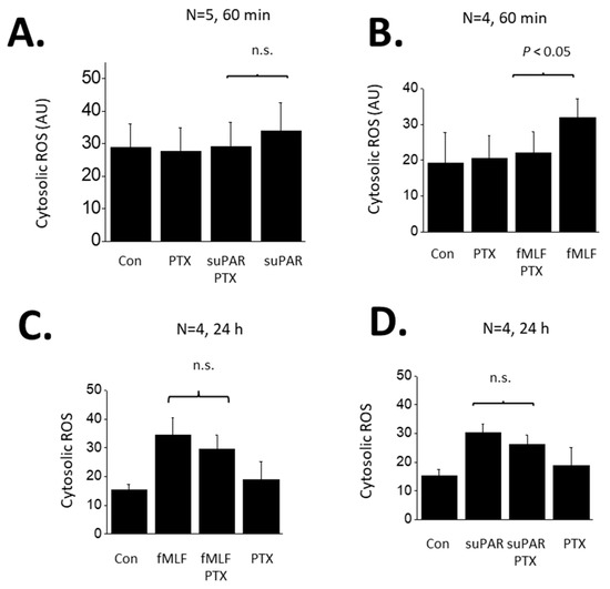 Role of G proteins in ROS generation evoked by suPAR and fMLF in podocytes. (A) Generation of cytosolic ROS evoked by 60 min exposure to 10 ng/mL suPAR. Note that this duration of suPAR exposure did not evoke a significant increase in cytosolic ROS that could be detected using the fluorescent probe. Pretreatment with PTX also had no effect. (B) A 60 min exposure to 1 μM fMLF evoked a significant increase in cytosolic ROS, and this effect was completely inhibited by pretreatment with PTX. (C) A 24 h exposure to 10 ng/mL suPAR evoked a significant increase in ROS that was also seen in cells pretreated with PTX. (D) A 24 h exposure to 1 μM fMLF evoked an increase in cytosolic ROS that was also observed in cells pretreated with PTX. In this and subsequent figures, n.s. denotes non-significant difference between groups underneath the brackets.