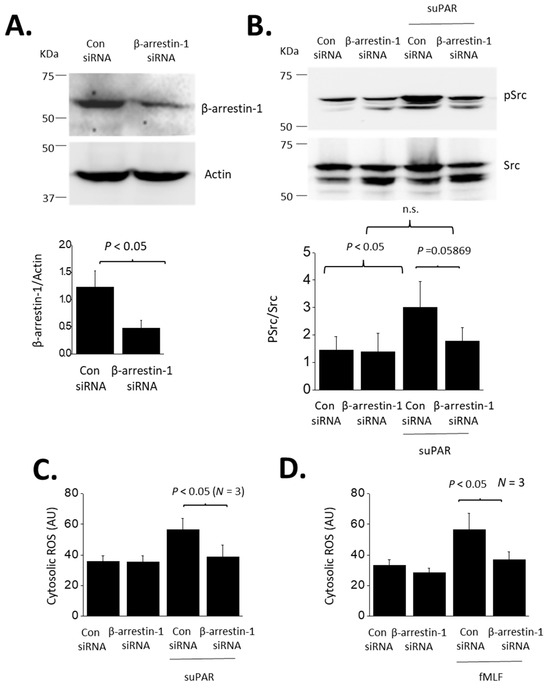 Role of β-arrestin-1 in suPAR signaling in podocytes. (A) Immunoblot showing significant reduction in β-arrestin-1 protein in cells transfected with a targeting siRNA, compared to cells transfected with a control siRNA. (B) β-arrestin-1 knockdown eliminated Src activation evoked by 24 h exposure to 10 ng/mL suPAR. The knockdown had no effect on untreated cells. (C) β-arrestin-1 eliminated cytosolic ROS accumulation evoked by 24 h exposure to suPAR. (D). β-arrestin-1 knockdown also eliminated ROS activation evoked by 24 h exposure to fMLF.