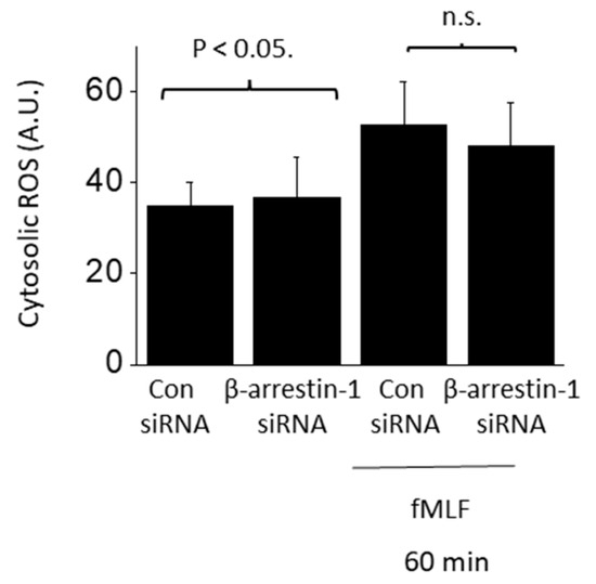 Rapid fMLF signaling does not require β-arrestin-1. Cytosolic ROS generation evoked by 60 min exposure to 1 µM fMLF persisted following siRNA knockdown of β-arrestin-1 (N = 3).