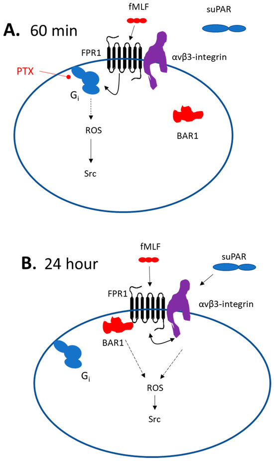 These data lend themselves to a variety of mechanistic interpretations, but one plausible model is shown in Figure 9. Short duration exposure to fMLF is proposed to cause activation of podocyte FPRs, presumably including Fpr1, which is transduced through a canonical pathway that entails PTX-sensitive Gαi, and from there to Nox2 and Src. As an aside, we note that Nox-2-dependent ROS generation is one of the most extensively studied responses to FPR activation in neutrophils [34]. In other words, this appears to be one of the canonical pathways. suPAR does not activate this pathway, possibly because it does not interact directly with podocyte FPRs, or because it is unable to induce a change in the conformation of the FPRs that would allow their interaction with Gαi-containing heterotrimeric G proteins. However, a 24 h exposure to either fMLF or suPAR evokes a BAR1-dependent and PTX-resistant pathway leading to ROS and Src. It is possible that interaction of BAR1 with podocyte Fpr1 allows it to trans-activate (and be trans-activated by) adjacent αVβ3-integrin receptors, which can enter a signaling conformation in response to stimuli originating on either side of the plasma membrane [45]. While the simplest mechanism would be if BAR1 acts as a simple scaffold to connect Fpr1 to αVβ3-integrin, we were unable to detect a direct biochemical interaction between BAR1 and either αV or β3 integrin subunits by co-immunoprecipitation in naïve podocytes or in podocytes that had been continuously exposed to suPAR for 24 h. It is possible that BAR1-integrin interactions in podocytes occur but are not stable enough to allow their detection by a co-immunoprecipitation method. However, it is also possible that some intermediary protein may be involved. One possibility is RAGE, which we have previously shown to be required for suPAR signal transduction in podocytes, and which interacts directly with αVβ3-integrin [21]. In fact, direct interactions between RAGE and FPRs have been reported in the transduction of signals evoked by amyloid beta (1–42) and S100 in glial cells [46]. Obviously, a 24 h period allows for many other hypotheses.