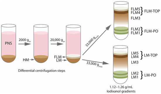 Scheme illustrating the major fractions generated during peroxisome purification, as performed in this work. For a detailed description of the separation protocol, see the Section 2 of the manuscript. Abbr.: PNS—post nuclear supernatant, HM—heavy mitochondrial fraction, LM—light mitochondrial fraction, FLM—“fluffy” layer of the light mitochondrial fraction, LM/FLM1–5: fractions of the corresponding density gradients analyzed using immunoblotting, LM/FLM-TOP, LM/FLM-PO—respective fractions analyzed using SWATH-MS.
