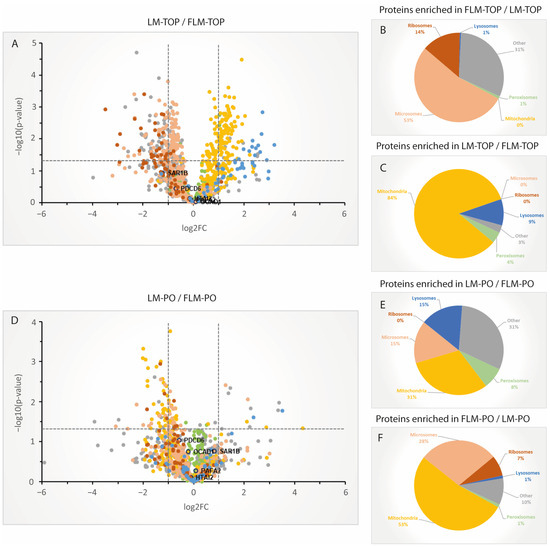 Organelle distribution of proteins quantified in the fractions analyzed using SWATH-MS. (A) Log2-scaled volcano plot depicting the quantification ratios for the individual proteins between LM-TOP and FLM-TOP. Proteins were color-coded, as indicated in (B). (B) Organelle annotation of the proteins shown in (A) (in %) significantly enriched in the FLM-TOP compared to the LM-TOP fraction (p < 0.05). (C) Organelle annotation of the proteins (in %) significantly enriched in the LM-TOP compared to the FLM-TOP fraction (p < 0.05). (D) Log2-scaled volcano plot depicting the quantification ratios of the individual proteins between LM-PO and FLM-PO. (E) Organelle annotation of the proteins (in %) significantly enriched in the LM-PO compared to the FLM-PO fraction (p < 0.05). (F) Organelle annotation of the proteins (in %) significantly enriched in the LM-PO compared to the FLM-PO fraction (p < 0.05).