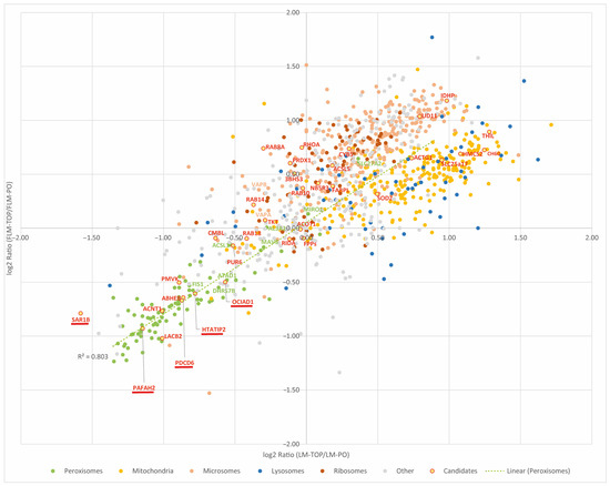 The annotated peroxisomal proteins form, according to their enrichment in the LM-PO and FLM-PO fractions, a third cluster at the opposite quadrant of the graph. Importantly, a linear regression for the peroxisomal proteins demonstrates their similar enrichment in LM-PO and FLM-PO (R2 = 0.8; Figure 5). Based on the log2 LM and FLM ratios, a machine learning-based prediction model was trained in order to associate the individual proteins with the clusters “peroxisomes”, “mitochondria”, “ER”, and “multilocalized” proteins, accessible in Supplementary Materials Data S1. Notably, several proteins like ABHEB, ACNT1, LACB2, and PMVK, which have been suggested for a peroxisomal localization [3], can be found in the cluster of the bona fide peroxisomal proteins, supporting their localization to the organelle (Figure 5). By contrast, several other proteins, which have been previously reported for a peroxisomal localization, locate plainly among the ER (NUD11, ACSL5, CYB5A) or mitochondrial protein cluster (THIL, SOD2, SLC25A17), implying that they are more likely contaminating proteins in peroxisome-enriched fractions. In addition to these three organelle clusters, a significant number of proteins showed no significant enrichment in either the LM/FLM-TOP or LM/FLM-PO fraction, thus grouping around the crossing of the y- and x-axis. A closer look at the nature of these proteins reveals that these are most likely not arbitrarily located in between the peroxisomal and mitochondrial/ER clusters: among the proteins are several proteins which were already described as being dually localized at both peroxisomes and mitochondria (e.g., MAVS, MIRO1) or peroxisomes and the ER (e.g., ACSL1, AL3A2). Moreover, several small GTPases, which seem to play a role in regulating peroxisomal processes [23], locate in this region (RAB14, RAB18, RAB10), but there are also the ER-tethering proteins VAPA and VAPB, which interact with peroxisomal tail-anchored proteins ACBD5 [21,22]. According to their location among the described organelle clusters, further hitherto uncharacterized proteins may be explored as candidates for a peroxisomal localization or to confirm their exclusive localization to mitochondria or the ER.