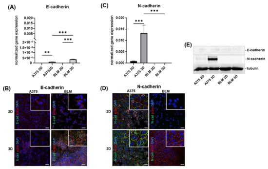 Herein, we show that E-cadherin gene expression was undetectable in A375 and BLM cell 2D monolayers, while very low levels were detected in 3D spheroids, with a significant up-regulation in BLM compared to A375 spheroids. Although the epithelial marker, E-cadherin was expressed at low levels, cortical actin, typical of epithelial cells, was detected in both A375 and BLM cells grown in 3D spheroids, with BLM revealing more intense immunoreactivity at the cell plasma membrane.