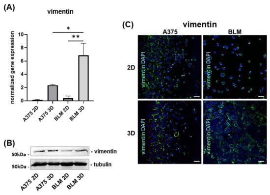 Bar graphs showing the mesenchymal marker vimentin mRNA levels in A375 and BLM melanoma cells (A). Data are expressed as means ± SD. (B) Representative Western blot analysis for vimentin expression in whole cell lysates showing its up-regulation in BLM 3D spheroids compared to 2D monolayers. (C) Representative micrographs of confocal microscopy showing vimentin expression in A375 and BLM cultured in different experimental settings. Green: vimentin; blue: DAPI. Original magnification: 40×. Scale bar: 25 µm. Duplicate samples for each cell line and experimental condition were run. Each experiment was repeated three times. * p < 0.05; ** p < 0.01.