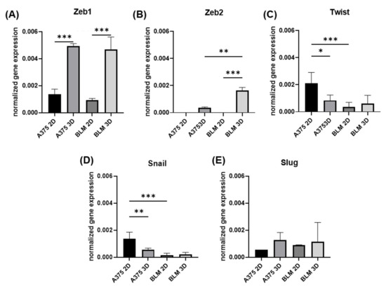 The Twist and Snail gene expressions were similar, revealing an opposite trend when compared to Zeb. They were expressed to higher extents in A375 compared to BLM cells (p < 0.001 for A375 2D vs. BLM 2D), and, although unaffected by 3D arrangement in BLM cells, the Snail mRNA levels were significantly lower in A375 3D spheroids compared to A375 2D monolayers (p < 0.01) (Figure 4C,D). No evident differences were detected for Slug gene expression (Figure 4E).