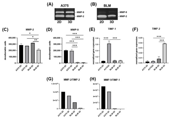 Gene expression for TIMP-1, the main inhibitor of MMP-9 [41], was significantly up-regulated in A375 spheroids compared to 2D monolayers (p < 0.001), but was expressed to a lower, but similar, extent in both 2D and 3D BLM cells (Figure 5E). A different pattern was detected for TIMP-2, the main inhibitor of MMP-2 [41], which was significantly up-regulated in 3D compared to 2D BLM cells (p < 0.001), while it remained expressed to a lower extent in both 2D and A375 cells (Figure 5F). Although the TIMP gene expression pattern was different in A375 and BLM cells, it was strongly affected by 3D arrangement in both of the cell lines. The MMP-2/TIMP-2, MMP-9, and TIMP-1 ratio was lower in BLM compared to A375 cells (Figure 5G and Figure 5H, respectively).