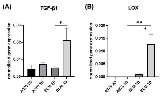 LOX and the LOX family members (LOXL 1-4) are up-regulated in several melanoma cell lines while their down-regulation or inhibition reduces the invasion of melanoma cells [28,90]. While undetectable in melanocytes and primary melanoma cells, LOX up-regulation was described in metastatic BLM cells and in the vertical growth phase of the WM793 melanoma cell line [28]. In our study, we investigated the LOX gene expression in relation to the EMT-related phenotype and differentiation state of melanoma cells for the first time. Our results confirm that the highest gene expression of LOX was found in the metastatic and less dedifferentiated BLM cells that were isolated from lung metastases compared to A375 cells, which revealed an almost undetectable expression. Interestingly, LOX was strongly affected by the 3D arrangement, which induced a significant up-regulation in BLM 3D spheroids compared to BLM 2D monolayer and A375 3D spheroids as well. Moreover, the up-regulation of LOX in BLM 3D spheroids was paralleled by TGF-β1 gene expression, which was able to induce LOX and LOX family gene expression [91].