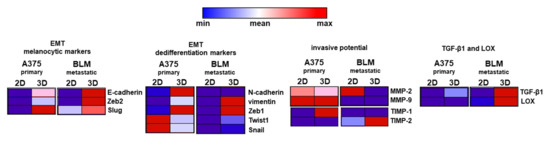 TGF-β1 is a master controller of EMT, able to influence the gene expression of EMT markers [5,8]. Its gene expression pattern was affected by the 3D arrangement, inducing a significant TGF-β1 up-regulation in 3D BLM compared to 2D monolayers. Conversely, TGF-β1 expression was similar in both 2D and 3D A375 cells. However, higher TGF-β1 mRNA levels were detected in 3D BLM compared to 3D A375 cells (Figure 6A).
