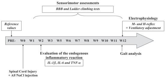 Two weeks (W2) after the injury, a subset of these animals from each group (n = 5 per group) was sacrificed to assess endogenous inflammation at the site of the spinal lesion. The remaining animals (n = 18; 6 animals in each group) were subjected to weekly assessments of sensory and motor recovery in the hindlimbs. Baseline measurements were taken one week prior to the injury (PRE-), and evaluations were continued from one week post-injury (W1) up to twelve weeks (W12) thereafter. The recovery progress was monitored using behavioral tests, namely, the BBB (Basso–Beattie–Bresnahan) and ladder-climbing tests. At the end of the twelve-week period (W12), a gait analysis test was performed, and sensorimotor loops were evaluated through electrophysiological recordings of the M-wave and H-reflex below the lesion site. Additionally, after inducing muscle fatigue, the medullary ventilatory center was evoked via the metabosensitive pathway. The chronological order of our protocol is schematically shown in Figure 1.