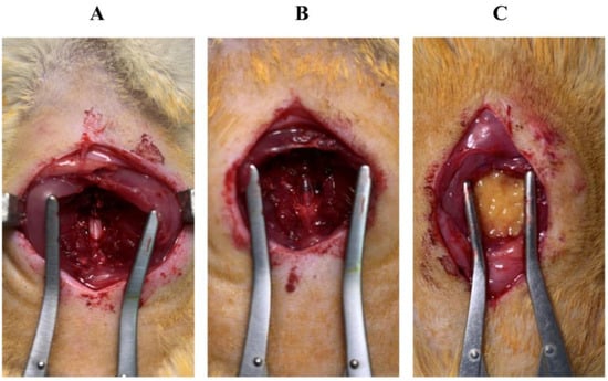 Exposed spinal cord. (A) Before the lesion. (B) After the contusion. (C) After transplantation. The contused spinal cord was covered with activated fat before the wounds were closed.