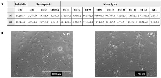 In vitro characterization of human adipose tissue cell cultures from AF. (A) Expression of cell surface markers. All percentages were obtained by flow cytometry analysis [27]. Results are expressed as mean ± SD of three independent experiments. (B) Live morphology of human adipose tissue-derived mesenchymal stem cells (hADSCs) obtained from AF. Pictures refer to two different preparations (sample 1: S1, and sample 2: S2) kept in culture at passage 1 (P1).