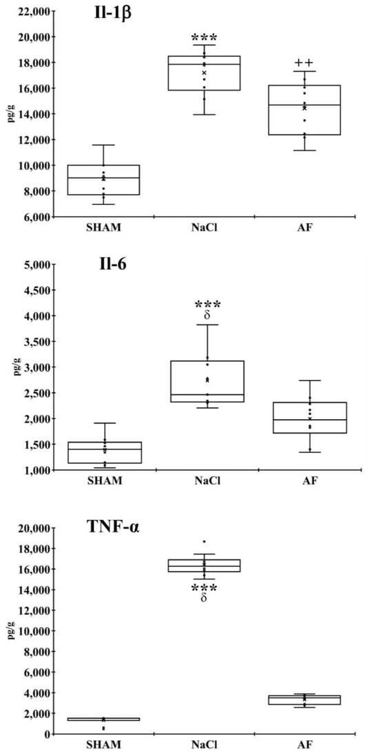 Inflammatory reaction at the lesion site. Concentrations of IL-1β, IL-6, and TNF-α at the site of injury in the SHAM, NaCl, and AF groups, two weeks post-injury indicated that the level of inflammation was higher in the NaCl group compared to the two other groups. Measurements were performed twice. Significant difference is indicated by * (NaCl group vs. SHAM group), + (AF group vs. SHAM group), or δ (NaCl group vs. AF group); 1 symbol, p < 0.05; 2 symbols, p < 0.01; and 3 symbols, p < 0.001. x and