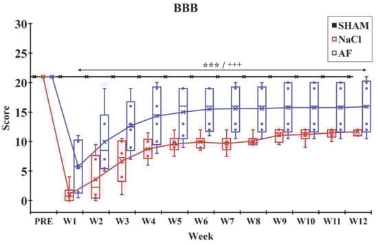 BBB locomotor rating scale. After the SCI, the BBB score in each injured group dropped significantly, and then a recovery was observed until W12. Data indicate a faster recovery in the AF group compared to the NaCl group. Significant difference in the BBB scores is indicated by * (NaCl group vs. SHAM group) or + (AF group vs. SHAM group); 3 symbols, p < 0.001. x and