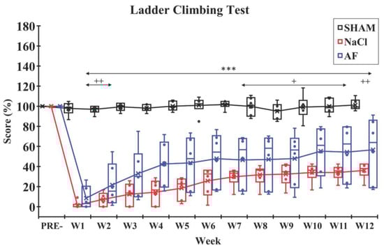 Ladder-climbing test. After the SCI, the climbing score in each injured group dropped significantly, and then a slow recovery was observed until W12. Significant difference in the climbing scores is indicated by * (NaCl group vs. SHAM group) or + (AF group vs. SHAM group); 1 symbol, p < 0.05; 2 symbols, p < 0.01; and 3 symbols, p < 0.001. x and