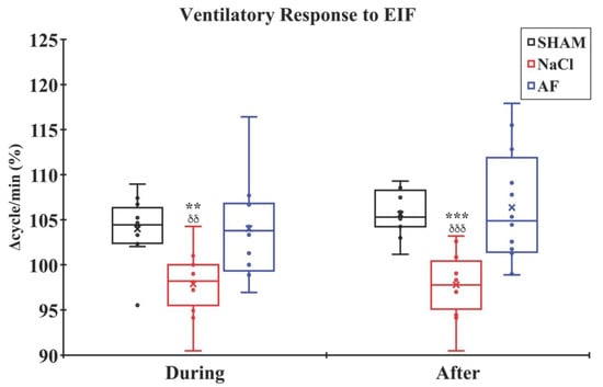 Ventilatory adjustment to 3 min EIF. The ventilatory activity significantly increased in the SHAM and AF groups during and after 3 min muscle stimulation of the Tibialis anterior muscle under local regional circulatory occlusion. Significant difference in the mean ventilatory frequency is indicated by * (NaCl group vs. SHAM group) or δ (NaCl group vs. AF group); 2 symbols, p < 0.01; and 3 symbols, p < 0.001. x and