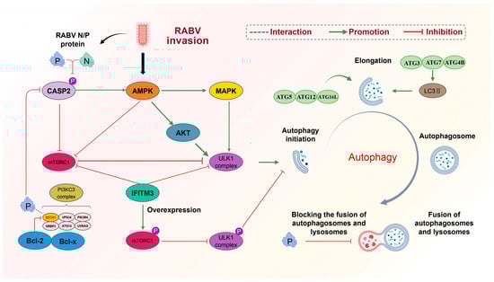 The mechanism of rabies virus-induced viral autophagy is still not well understood. Here, we discuss the results of previous studies with the aim of clarifying the mechanism of virus-induced autophagy. We analyze one strategy for the regulation of autophagy by RABV virus in terms of its need for replication. First, RABV requires the site and environment of autophagosomes to help it replicate and escape the immune system, so RABV infection is usually able to activate autophagy [57,61]. RABV targets a number of autophagy-activated targets for regulation, such as mTOR, AKT, AMPK, MAPK (ERK1/2), ULK1, CASP2, and others. Second, in order for RABV to proliferate further in large numbers, it usually causes only the onset of autophagy and the accumulation of autophagosomes but prevents the fusion of autophagosomes and lysosomes [61,64,65,66]. For example, the P protein of RABV can bind Beclin1 in the PI3KC3 complex and hinder the formation of autophagic lysosomes. In conclusion, RABV can regulate the process of cellular autophagy according to its own needs [67,68,69].