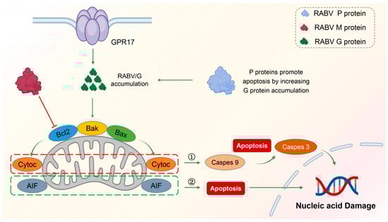 : inhabition. Mechanism of RABV-induced mitochondrial apoptosis. RABV is able to cause mitochondrial apoptosis in late replication and is regulated by the BCL-2 family of genes. The three proteins of RABV, M, G, and P are closely related to apoptosis. The M protein inhibits the anti-apoptotic gene Bcl2, causing mitochondrial apoptosis and the release of cytochrome C and AIF factors. Caspase-dependent pathway (➀): released cytochrome C activates caspase-9, which further activates the downstream caspase-3, causing apoptosis. Non-caspase-dependent pathway (➁): released AIF can directly cause apoptosis.