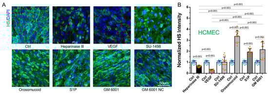 Because the endothelial surface glycocalyx is a major barrier of the BBB to macromolecules [52] and HS is the most abundant component of the glycosaminoglycans of the endothelial glycocalyx [22,23,53], we first examined the changes in the BBB permeability due to Dextran-70k (PDex−70k) after HS modulation by various agents. Figure 3A shows that the disruption of HS by heparinase III and VEGF increases PDex−70k to 1.6 and 1.5 folds of the control, respectively. In contrast, reinforcing HS by orosomucoid, S1P, and GM 6001 decreases PDex−70k to 71%, 81%, and 63% of the control, correspondingly. Previously, it was found that VEGF not only degrades the HS but also disrupts the endothelial tight junctions in vitro [33] and in vivo [34]. As tight junctions are the major barrier to ions and small molecules, we also examined the effects of various HS-modulating agents on the TEER of the BBB since the reciprocal of the TEER represents the permeability to ions [51,52]. Figure 3B demonstrates that endothelial HS-disrupting agents, heparinase III and VEGF, also slightly disrupts endothelial tight junctions by decreasing the TEER by 9% and 14% than that of the control, respectively. Endothelial HS-enhancing agents orosomucoid and S1P moderately increase the TEER by 11% and 13% than that of the controls, correspondingly, suggesting they also reinforce the endothelial junctions. Although HS-enhancing agent GM 6001 decreases the BBB permeability to dextran-70k, it does not change the TEER, suggesting that GM 6001 only affects the glycocalyx. The inhibition of VEGFR2 by SU-1498 has no effect on either the BBB permeability to dextran-70k or the TEER.