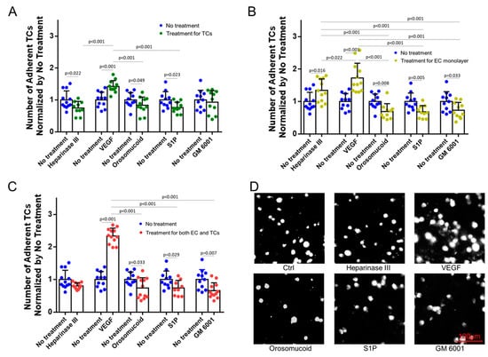 Effects of heparan sulfate (HS) modulation by various agents on MB231 adhesion to in vitro BBB. Number of adherent MB231 cells to the BBB under no treatment (control) and after various pretreatments: (A) for MB231 cells only, (B) for the BBB (EC monolayer) only, and (C) for both MB231 cells and the BBB. (D) Fluorescent microscopic images for adherent MB231 cells to the BBB after various treatments for both MB231 cells and the BBB. Values are presented as mean ± SD. n ≥ 10 fields (334 µm × 436 µm for each field) from 3 independent experiments analyzed for each case. No significant difference between no treatment and GM 6001 NC (not shown in the plots).