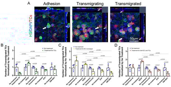 However, how the enhanced HS of MB231 and the reduced HS of the BBB due to VEGF or the modulated HS of the glycocalyx of endothelial and tumor cells can influence tumor cell adhesion/transmigration to/across endothelial barriers is largely unknown. Therefore, in this study, we tested the hypothesis that reducing/enhancing breast cancer cell (MB231) HS while enhancing/reducing HS at the BBB can inhibit/promote MB231 adhesion/transmigration to/across the BBB. To test this hypothesis, we generated an in vitro BBB by culturing hCMECs on either a glass-bottom dish or a Transwell filter. We first quantified the HS of the BBB and that of MB231 after treatment with VEGF, or with endothelial HS-enhancing agents, orosomucoid, sphingosine-1-phosphate (S1P), and a generic matrix metalloproteinase (MMP) inhibitor, GM6001, or with an enzyme, heparinase III, which can degrade endothelial HS. Then, we quantified the adhesion and transmigration of MB231 to/across the BBB after pretreatment with these agents to (1) MB231 only, (2) BBB only, and (3) both MB 231 and BBB.