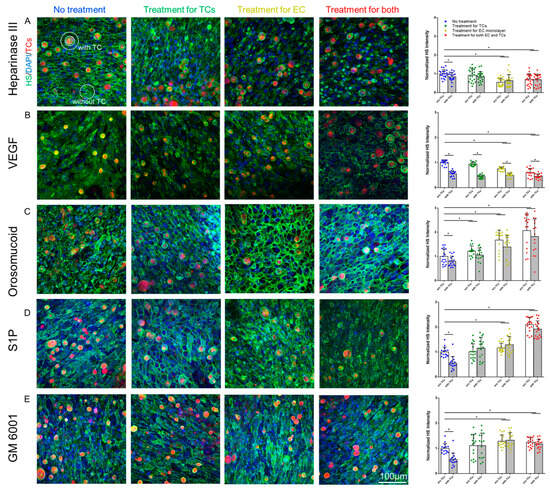 Effects of MB231 adhesion and various treatments on heparan sulfate (HS) at an in vitro BBB. The left panels show the confocal images of HS at the BBB and adherent MB231 (red) under no treatment and after the pretreatment of heparinase III (A), VEGF (B), orosomucoid (C), S1P (D), and GM 6001 (E), and the right plots show the HS intensity of the BBB in the region of interest (ROI) with and without adherent MB231 cells under each case. The image on the upper left corner of (A) defines the ROIs with and without adherent MB231 cells (TC). The average HS intensity of the region in between two concentric circles, excluding TCs, (upper left) is that for the ROI with adherent TCs and the average HS intensity of the circled region (lower right) is that for the ROI without adherent TCs. * p < 0.05. Values are presented as mean ± SD. n ≥ 30 ROIs (at least 15 ROIs with adherent TCs and 15 without adherent TCs) analyzed for each case.