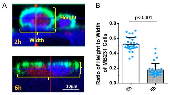 The ratio of height-to-width of MB231 cells as a function of adhesion time on in vitro BBB. (A) Confocal images showing the side view of adherent MB231 cells on the BBB formed on a Transwell filter at 2 h (top) and 6 h (bottom). (B) Comparison of the ratio of cell height-to-width between 2 h and 6 h adhesion after seeding. Values are presented as mean ± SD. n ≥ 30 MB231 cells were analyzed for each time.