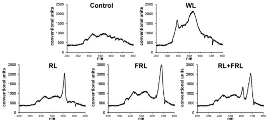 The experiment involving additional irradiation was carried out under the greenhouse conditions of the K.A. Timiryazev Institute of Plant Physiology RAS Moscow (GPS 55.841167, 37.586320). The experiment was carried out on 2-year-old saplings of Scots pine (Pinus sylvestris L.), which were dormant after the winter period and growing in 0.7 L pots filled with soil substrate (peat, sand, ground limestone, 350 mg/L N, 30 mg/L P, 400 mg/L K, pH 5.5–6.0). The experiment was carried out from 1 April 2022 to 10 May 2022. The duration of daylight hours was 13–16 h (on average, sunrise at 5:00 am and sunset at 20:00). The sun was at its zenith on average at 12:30, and the average intensity of sunlight during this period was 250 ± 100 μmol m–2s–1. A shade net was used to diffuse direct sunlight. Additional light was applied for 14 h from 7:00 to 21:00, and the intensity of the light flux under any additional illumination was 250 ± 20 µmol m–2s–1. The plants were illuminated with diode matrices (Epistar, Taiwan), with red light (RL) at 660 nm (250 µmol m–2s–1), far-red light (FRL) at 720 nm (250 µmol m–2s–1), broadband white LEDs (WL) (250 µmol m–2s–1) and red + far-red light (RL+FRL) at 660 nm + 720 nm (125 + 125 µmol m–2s–1). The RL/FRL ratio under sunlight and white LED lamps was 1 for RL-1.7, 0.4 for FRL and 0.5 for RL +FRL (Figure 1). The average temperature in the greenhouse was 24 ± 5 °C during the day and 17 ± 5 °C during the night, and the average humidity was 50–80%. The plants were watered regularly.