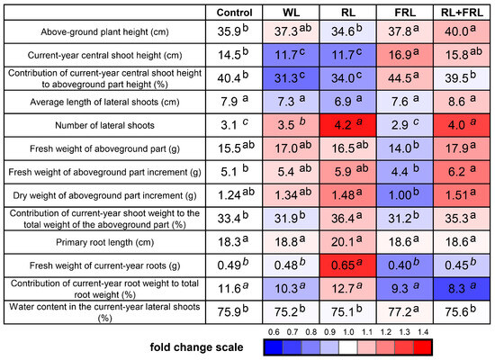 At the end of the experiment, the following plant growth characteristics were measured: the aboveground height, current-year central shoot height, current-year central shoot height contribution to the aboveground height, average length of current-year lateral shoots, number of current-year lateral shoots, fresh weight of the aboveground part, increase in the fresh weight of the aboveground part, increase in the dry weight of the aboveground part, contribution of the current-year shoot weight to the total weight of the aboveground part, primary root length, fresh weight of the current-year roots and contribution of the current-year root weight to the total root weight and water content of the current-year lateral shoots.