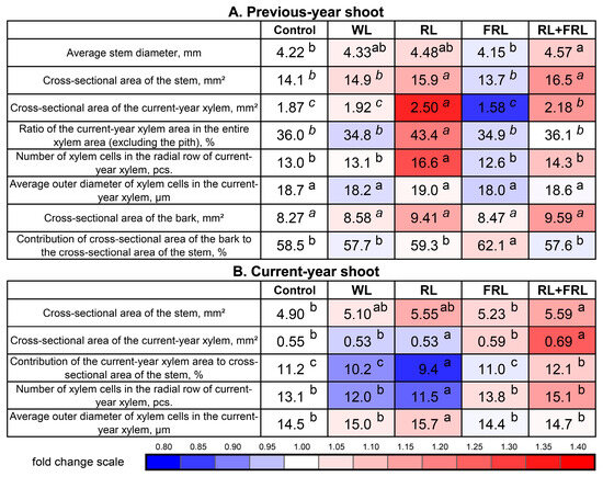 The results of the anatomical analyses of the current-year shoot that formed during the experiment were less pronounced because, in the RL variant, only an increase in the average diameter of one xylem cell of the current-year shoot was observed (Figure 4B). The main changes occurred under the combined treatment (RL+FRL), which caused an increase in the ratio of the cross-sectional area of the current-year and previous-year xylems, the average number of xylem cells in the radial row of the current-year xylem and the average length of the radial row of the current-year xylem (Figure 4B). The remaining parameters did not differ significantly among the light regimes.