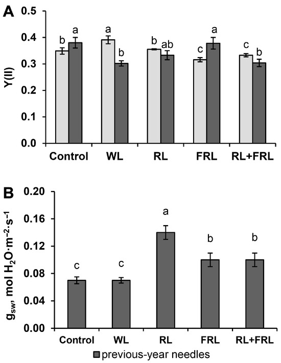 Effect of additional light on Y(II) (PSII effective quantum yield) (A) and stomatal conductance (gsw, mol H2O m−2s−1) (B) in previous-year and current-year needles of Scots pine. Different letters indicate significant differences (p < 0.05) according to ANOVA followed by Duncan’s multiple range post hoc test (regular letters). The values presented in the tables and figures are the arithmetic means ± standard errors.