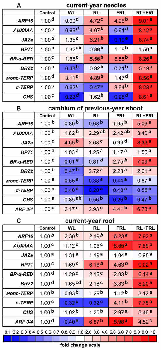 Effects of additional light on the expression of several hormone signaling genes, namely, auxin response factor 16 (ARF16), auxin response factor 3/4 (ARF3/4), auxin-induced protein 1 (AUX/IAA), jasmonate–Zim domain 1 (JAZa), histidine-containing phosphotransfer 1 (HPT1), Steroid 5-α-reductase (BR–α–RED) and brassinosteroid-mediated signaling pathway gene (BRZ2), and on genes involved in secondary metabolite biosynthesis, namely, monoterpene synthases such as TPS–mono1 (mono-TERP), α-terpineol synthase TPS–α-terp (α-TERP) and chalcone synthase (CHS) in current-year needles (A); cambium of previous-year shoots (B); and current-year roots (C). The color scale indicates how many times the expression changes: dark red represents a change of more than 2 times, and dark blue represents a change of more than 2 times relative to the control of sunlight without additional light. The transcript levels were normalized to the expression of the Actin1 gene in the aboveground organs and to the expression of the GAPDH gene in the roots. Gene expression under sunlight without additional light was used as one unit. Different letters within each row indicate significant differences (p < 0.05) according to ANOVA on ranks followed by Duncan’s multiple range post hoc test (regular letters) or Kruskal-Wallis one-way ANOVA on ranks followed by Student-Newman-Keuls post hoc test (italic letters).