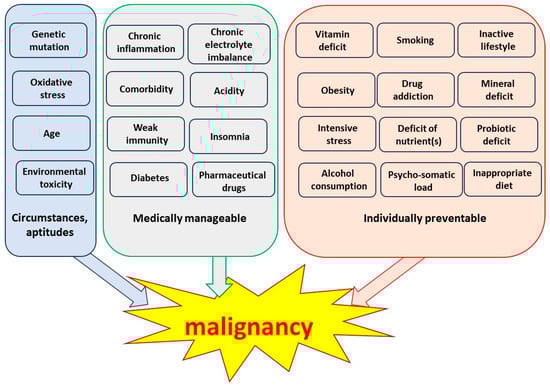 According to our current knowledge, there can be many reasons for developing a malignant tumor. Some of these are biological characteristics depending on the condition, others require medical intervention, and a large group of causes can be treated individually, controlling the lifestyle. Figure 1 shows some of the most known causes of cancer. Naturally, we have no idea why those 4–7 factors accumulate and cause the clinical symptoms.