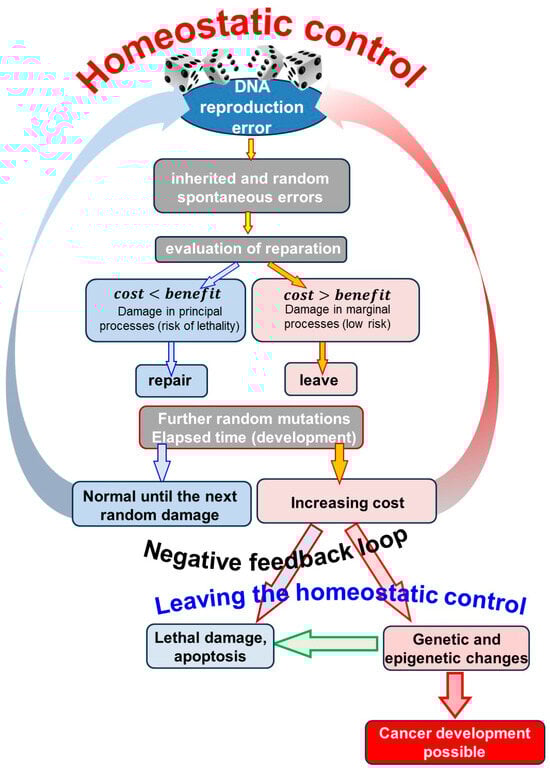 The change is always evaluated based on the cost/benefit ratio in a short decision-making time frame. Statistically, random mutation is an unfavorable event. Thus, a dilemma appears: to “invest” (cost) in correcting the error or to leave it because it is marginal. The cost to repair is more than the benefit of leaving it unrepaired. If the mutation is potentially lethal, the benefits of action outweigh the costs, and reparations are mandatory. The repair is expensive but avoids the worst, so the payoff is higher than the cost. After restoration, homeostatic regulation resumes, more random mutations occur, and the cycle repeats. The situation is different when the mutation is not lethal, the damage is marginal, and the benefit of the action is small compared to the repair cost. In this case, the damage remains uncorrected [,]. Over time, more random mutations appear. Even though the uncorrected mutations are individually marginal, they, together in a set, can pose a severe challenge in maintaining homeostasis. The cost of reparation of accumulated mutations increases; thus, the probability of reparation decreases. The collection of mutations presents multifaceted challenges, and the increasing costs may be too high to repair. The system tries to find other solutions to survive. The adaptation answer on the induced genetic or epigenetic changes increases cancer’s probability (Figure 2).