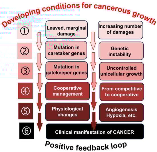 The tumor develops genetically in subsequent cell populations, not in a single cell. The Darwinian evolution for species is valid for the selective development of the cells during the line of successive cellular divisions when the cell fitness decides its viability. Cellular selection is based on the cell’s genetic information, so it is not the cell. Still, it is molecular information that is selected during a process, and the cell is only a carrier of the genetic structure. The selection of the randomly mutated genes (mutated cells) is already present in the population of multicellular organisms. Their fate can be interpreted based on evolution, similar to the population level of species, which is guided by Darwin’s law. The most viable cell wins. The nonlinear Darwinian considerations may divide the cancer development into six distinguishable steps when the game strategy varies due to the changes in the challenges under the permanently created random mutations (Figure 3).