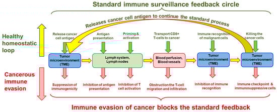 Another systemic effect is that the cancer evades the immune system’s surveillance, thus disrupting the natural collective control throughout the body (Figure 4). The physiological homeostatic impact, including the metabolic resetting, creates a new balance until the cancer cells are in the subclinical phase. Still, the governing feedback turns positive with the clinical stage, and the growth of the tumor becomes exponential.