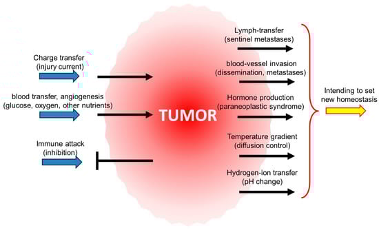 The physiological changes reshape homeostatic control. The charge (injury current), liquid (blood and lymph) transport, and immune inhibition set a condition to reset homeostasis. The consequences are the dissemination of the malignant cells, a particular hormone production, increased diffusional possibilities, and lowered pH. Note that the retuning of the body’s equilibrium supports the tumor-organs hypothesis and does not fit the atavistic explanations.