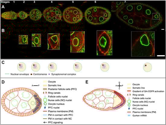 - McLaughlin, J.M.; Bratu, D.P. Drosophila melanogaster Oogenesis: An Overview. In Drosophila Oogenesis: Methods and Protocols; Bratu, D.P., McNeil, G.P., Eds.; Springer New York: New York, NY, USA, 2015; pp. 1–20. [Google Scholar] [CrossRef]