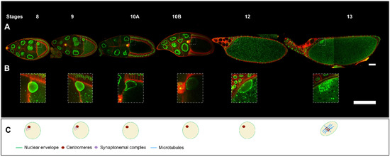Following an asymmetric division, a germline stem cell (GSC) produces another stem cell and a cystoblast, which undergoes four incomplete mitotic divisions to generate a cyst of 16 cells connected by cytoplasmic bridges or “ring canals” []. Initially, two cells within the cyst with four ring canals initiate premeiotic development with the pairing of homologous chromosomes and the assembly of the synaptonemal complex along the chromosome arms []. Then, at stage 1 in the germarium, one of these two cells differentiates into an oocyte, remaining in meiosis, while the 15 other cells of the cyst exit meiosis and eventually endoreplicate their genome to become nurse cells. The oocyte nucleus arrested in prophase of meiosis I, is transcriptionally quiescent or at least poorly active and the chromosomes are condensed in a structure named karyosome. Nurse cells become highly polyploids and provide the oocyte with all types of RNAs, proteins, and cellular organelles []. Similarly to mammals, there is a long pause in meiotic prophase, between the pachytene stage where recombination occurs and the metaphase I stage where a meiotic spindle assembles at stage 13 [].