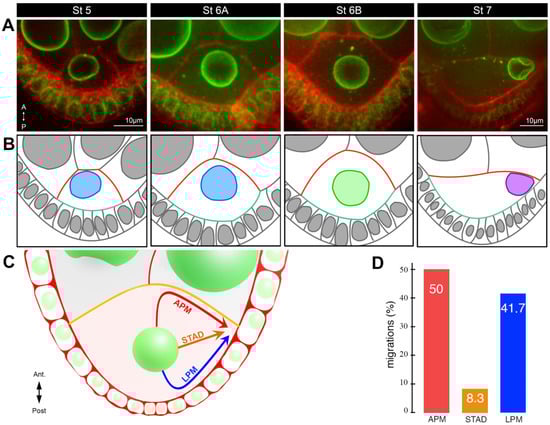 Characterisation of nucleus positioning before and during migration. (A) Stage 5–7 egg chambers, expressing Fs(2)Ket-GFP to label nuclei (green) and stained with Cellmask, a lipophilic dye to reveal plasma membranes (red). Representative examples of the different nuclear positions at stages 5, 6A, 6B, and 7 adapted from []. The oocytes are oriented with anterior (A) at the top and posterior (P) at the bottom. (B) Schematic representations of the image above, with a color code illustrating the evolution of the oocyte shape (anterior plasma membrane in red, posterior plasma membrane in turquoise) and the position of the nucleus: anterior, pale blue; center, pale green; migrated to the intersection between anterior plasma membrane and the lateral plasma membrane, purple adapted from []. (C) Schematic illustration of the three alternative routes by which the nucleus migrates to the antero-dorsal cortex in the oocyte: along the anterior plasma membrane (APM), through the cytoplasm (STAD), or along the lateral plasma membrane (LPM) []. (D) Bar plots of the distribution of the three different migration paths taken by the nuclei [].